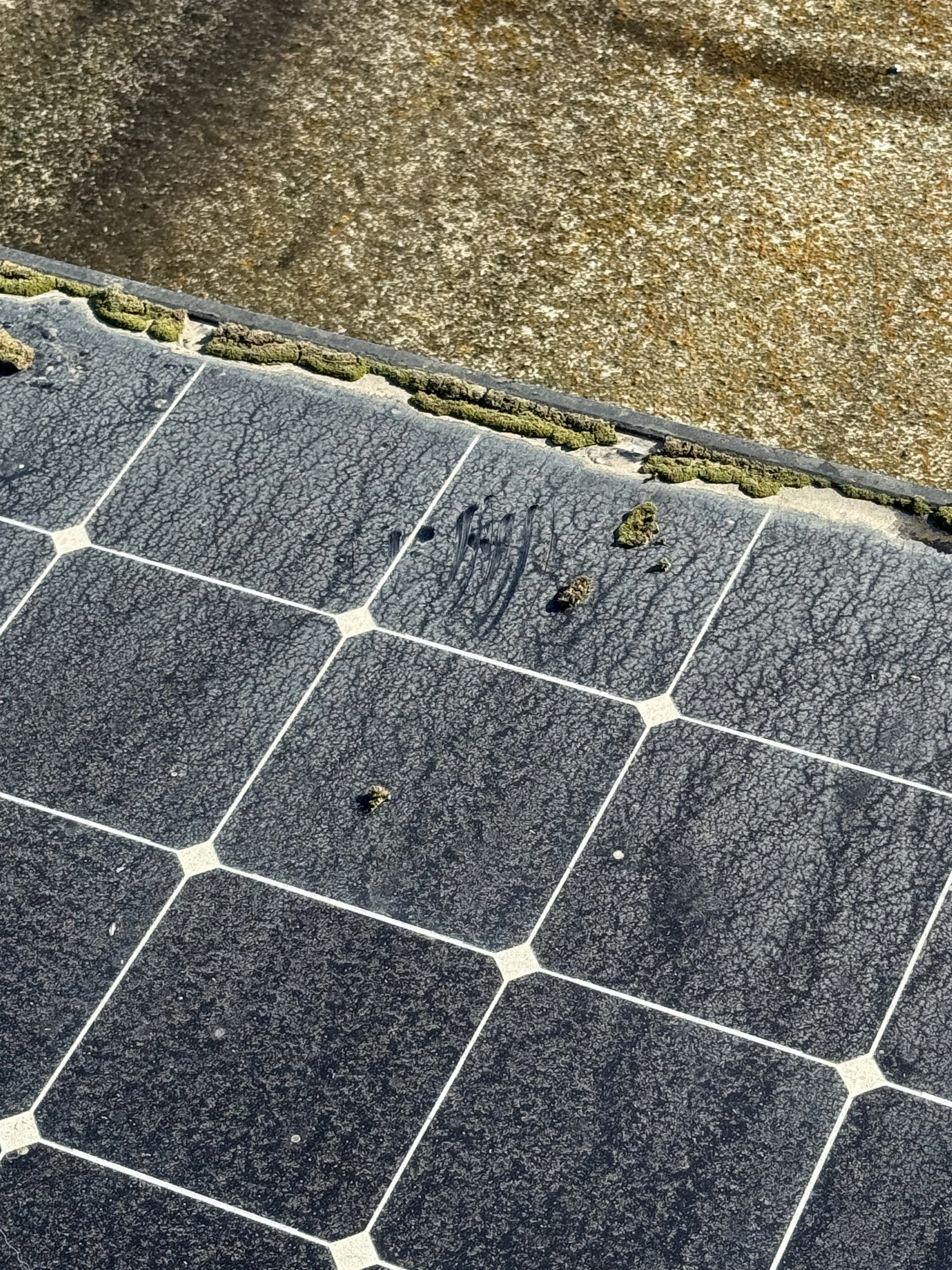 If you’re like most homeowners, probably never. But dirty panels aren’t just ugly, they’re costing you money. Over time, debris, dust, bird droppings, and even moss buildup (like in the photo below) can block sunlight and reduce efficiency by up to 30%.